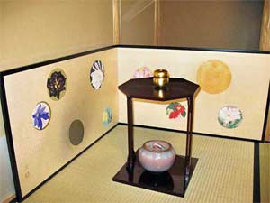 特に お気に入りは、写真の 風炉先屏風。(あまり よく見えませんが)日本画家、伊藤波留美さんの作品で、「日月草花」と 題され、その名のとうり 日と月、そして 私の大好きな花々・・・月下美人、月見草、蓮など・・・を 描いたものです。本当は、お茶室には はんなりしすぎるかもしれませんが、どうしても これが使いたかったのです。![]()