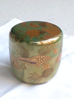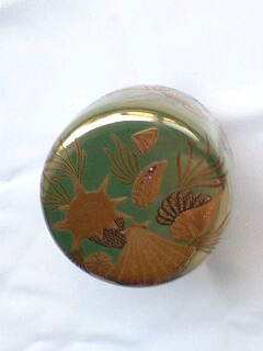 金色のヴェールをかけたような 珍しい海松色の塗りに、螺鈿と金彩とで 海中の貝が 描かれています。