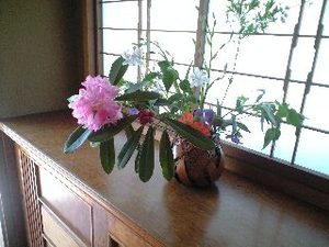 玄関の 迎え花も、会員のお庭に咲いていましたものを さりげなく。 芍薬や シャガ、シダの芽など。