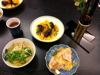 彩りが 少々地味ですが、豚肉とキャベツの重ね蒸し、もやしとカボチャやピータンのエスニック風、たっぷりと生姜を効かせましたにゅう麺は、麺よりセリの分量の方が多いくらいです。