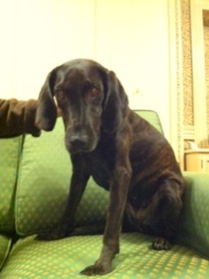 ソファーに座って、カメラを向けられ、少々緊張気味の福ちゃんです。
