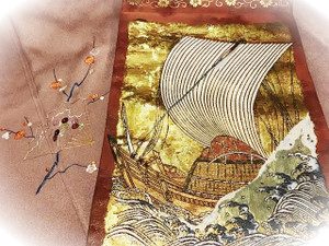私の帯は、波を切り開いて進む北前船で、幸先良さを願います。