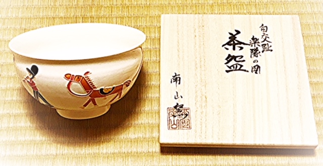 男の子のためのお茶碗は、午年生まれに因んで、馬と楽隊のおもちゃが描かれたものです。