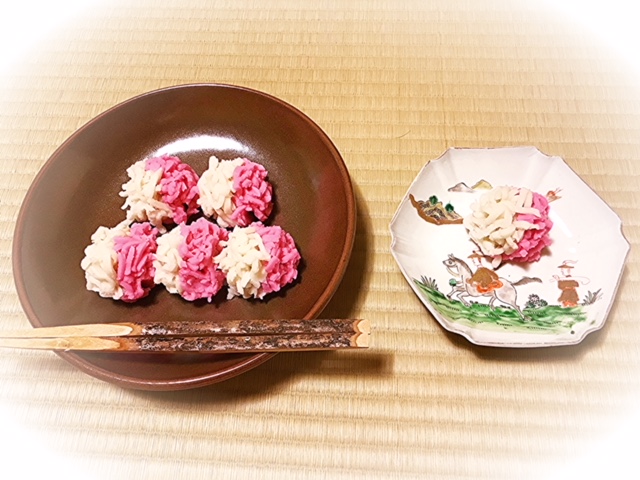 末富さんに作っていただきました紅白お祝い金団のお菓子をのせましたお皿は、やはり馬の描かれました骨董です。