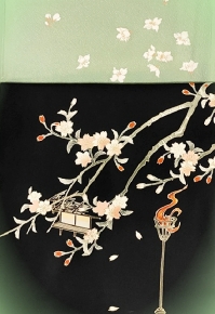 円山公園の枝垂れ桜と篝火を、友禅で染めました塩瀬帯です。