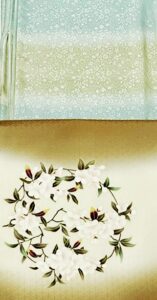 帯は、着物の地色を引いて、ベージュ色地に花水木の花枝を染めましたものです。